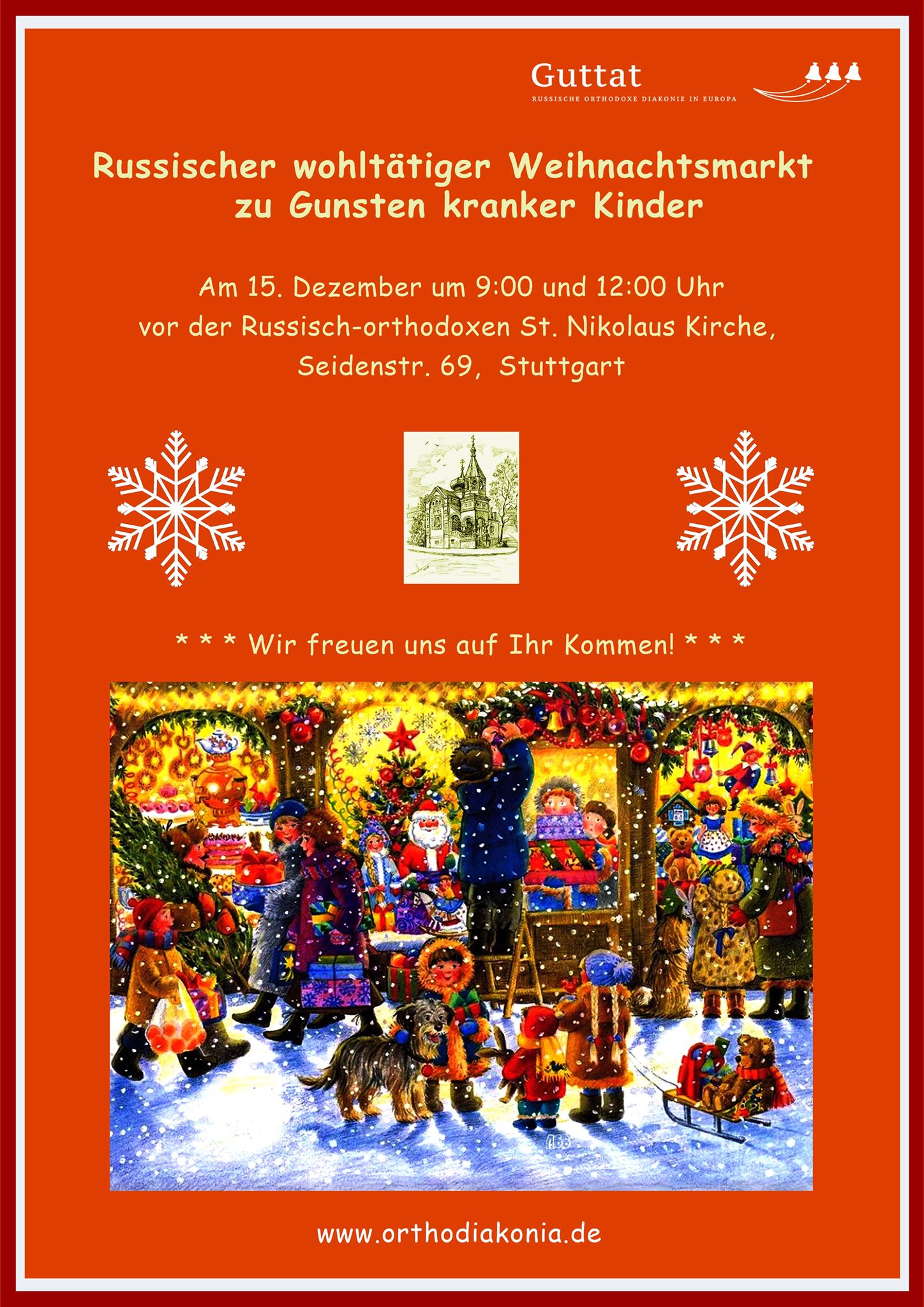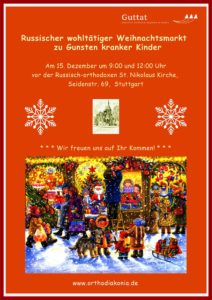 ein Weihnachlicher-Wohltärigkeits-Basar statt. Sie werden dort selbstgebastelte Geschenke und Weihnachts-Dekoration erwerben, hausgemachte Kuchen, leckeren Punsch und Glüwein probieren können. Der Erlös wird vollständig an kranke Kinder aus Russland und der Ukraine gespendet.